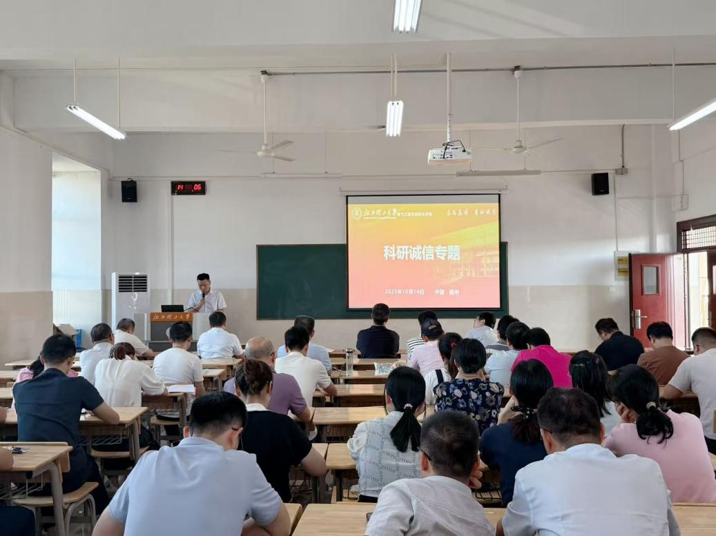 院长助理胡海林进行了科研诚信专题教育。他强调科研诚信是科学研究的基石,是科研工作者必须遵守的基本准则。要求全体教职工在科研活动中,严格遵守学术规范,杜绝学术不端行为,确保科研成果的真实性和可靠性。通过案例分析等方式,让教职工深刻认识到科研失信行为的严重后果,引导大家树立正确的科研价值观。